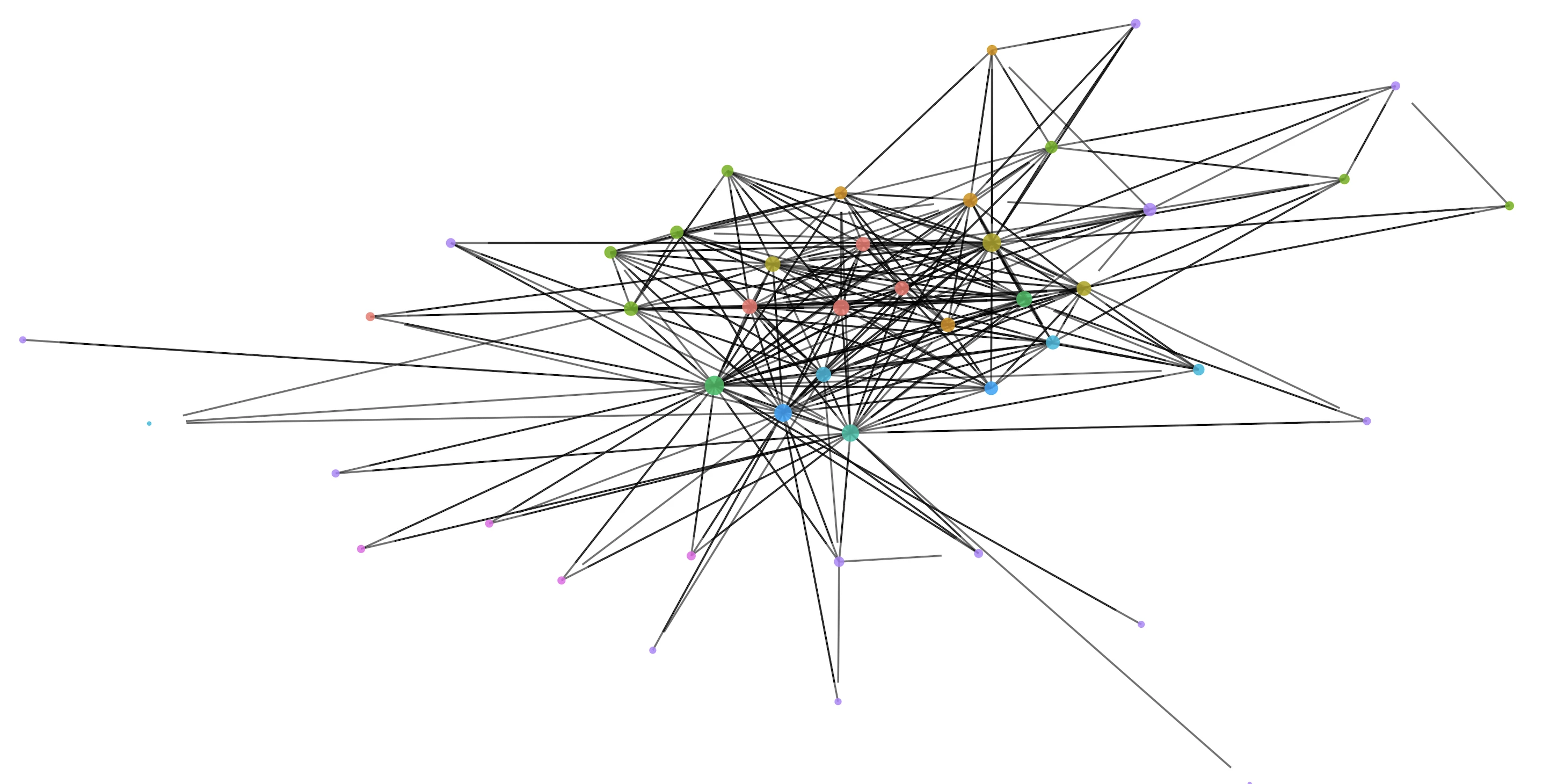 Network graphs showing patterns of collaboration via Slack (network picture on the top) and emails (network picture on the bottom) within Time is Ltd. company. Normally, we present this type of data at the aggregated (team or departmental) level, but here for R&D purposes the nodes in the networks represent individual employees and the edges correspond to the communication links between them. The size of the nodes and thickness of the edges are proportional to the number of direct contacts one has in the network and intensity of the communication, respectively. The color of the nodes represents departments individual employees belong to.