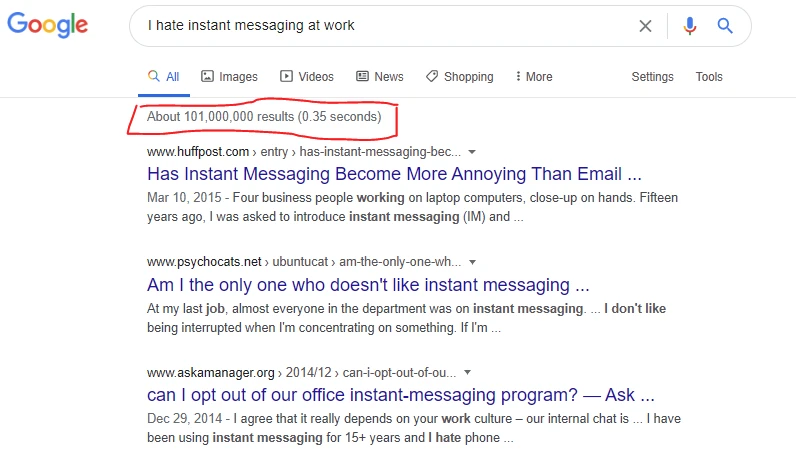 That being said we should take the results from the Slack 2018 study with a healthy grain of salt, given the conflict of interests. Both our personal experience with IM (as shown by the sheer amount of hits generated when googling the phrase “I hate instant messaging at work”), and more rigorous scientific evidence testify that supposed pros of IM are accompanied with many cons. The most common ones being...